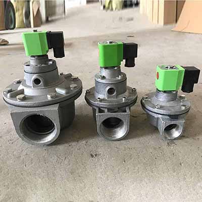 電磁脈沖閥的特征是閥的空氣進(jìn)出口管呈90度直角。閥內(nèi)的膜片把脈沖閥分成前、后兩個(gè)氣室,高壓氣從進(jìn)氣口接入,進(jìn)入下氣室,當(dāng)脈沖閥未得電時(shí),氣體通過上下兩殼體的恒壓管道以及其中的節(jié)流孔進(jìn)入減壓室,由于閥芯在彈簧的作用下堵住泄壓孔,氣體不會(huì)排出,令減壓室和下氣室的壓力一致,而在彈簧作用下,膜片將噴吹口堵住,氣體不會(huì)沖出。當(dāng)脈沖閥得電時(shí),閥芯在電磁力作用下向上抬起,泄壓孔打開,氣體噴出,由于恒壓管道節(jié)流孔的作用,泄壓孔的流出速度大于減壓室恒壓管氣體的流入速度,令減壓室壓力低于下氣室的壓力,下氣室的氣體將膜片頂起,打開噴吹口。