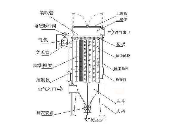 中箱體:由多孔板、濾袋裝置和文氏管組成。